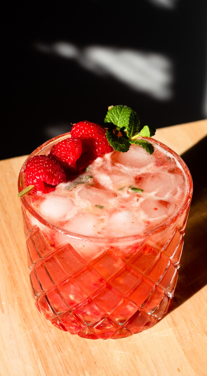 2. Combine all ingredients in a cocktail shaker, hold 1 raspberry
