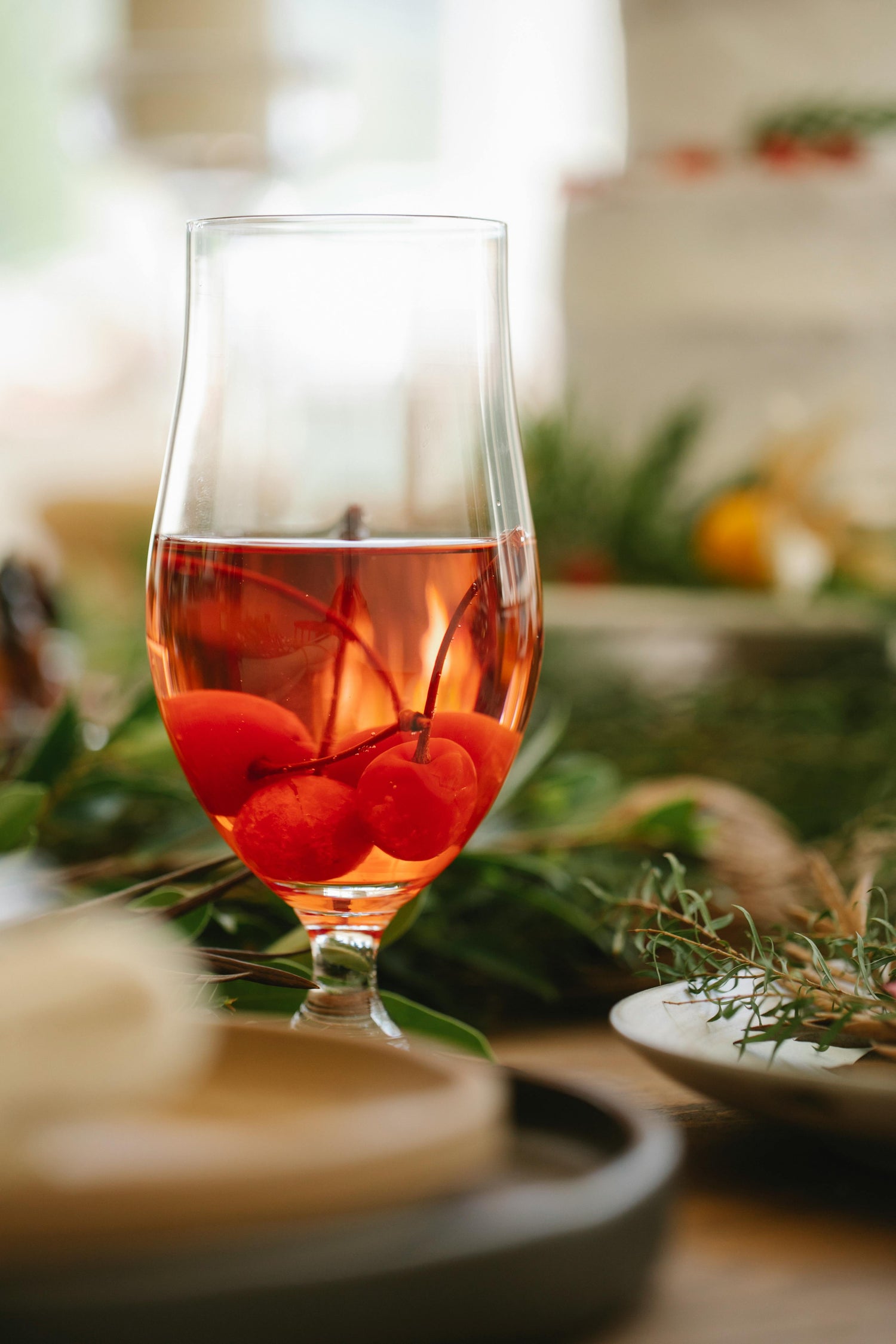 4. Pour into a mug and garnish with skewered maraschino cherry and loose coconut flakes